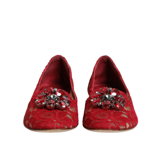 Dolce & Gabbana Red Lace Crystal Ballet Flats Loafers Shoes