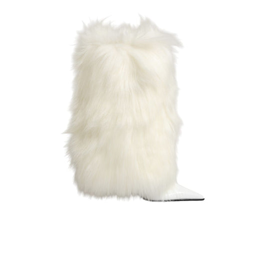 Dolce & Gabbana White Fur Pointed Knee High Stiletto Boots Shoes
