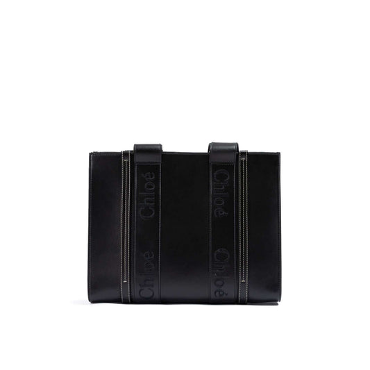 Chloé Black Woody Embroidered Logo Leather Medium Tote Bag